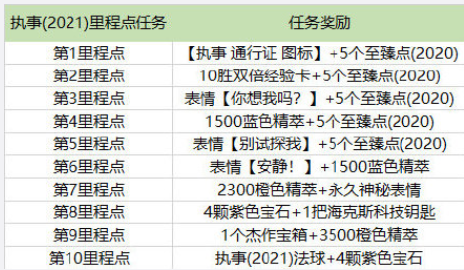 可通过完成通行证里程点任务解锁丰厚奖励,总计10个里程点任务,完成里程点1才可解锁里程点2,以此类推,另外通过每周依次解锁的周常任务还可获得1000枚执事(2021)币。